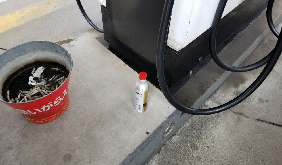 GSに到着して、ガソリン添加剤のボトルを持って降り、給油はセルフ式ですので、まず給油口にガソリン添加剤を入れる。